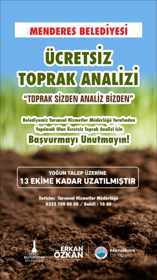 Menderes Belediyesi tarafından İzmir Büyükşehir Belediyesi’nin de desteğiyle çiftçilere yönelik düzenlenen ücretsiz toprak analizi projesinde başvuru süresi yoğun talep nedeniyle ileri tarihe çekildi. Menderes Belediye Başkan V. Erkan Özkan, üreticilerin 13 Ekim tarihine kadar başvurularını belediyeye yapabileceğini açıkladı.