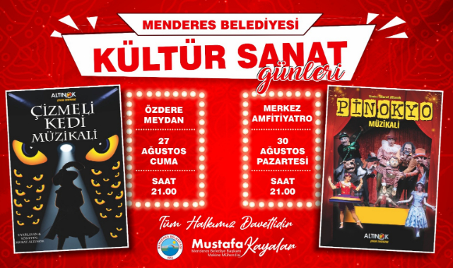 Menderes Belediyesi Kültür Müdürlüğü tarafından gerçekleştirilen Kültür Sanat Günleri kapsamında çocuklara yönelik tiyatro oyunu sergilenecek. Çizmeli Kedi müzikali 27 Ağustos Cuma günü Özdere Meydanı’nda saat 21:00’da sahne alırken, Pinokyo müzikali 30 Ağustos Pazartesi günü menderes belediyesi Amfitiyatro’da saat 21:00’da sahnelenecek.