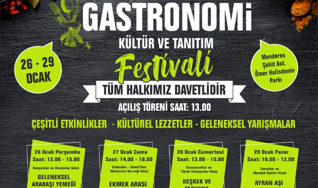 Menderes Şehit Astsubay Ömer Halisdemir Parkı’nda gerçekleşecek festivalde birbirinden farklı etkinlikler vatandaşlarla buluşacak.İlçede bulunan 10 STK ile Menderes Belediyesi ve İzmir Büyükşehir Belediyesi’nin de paydaş olduğu festival Menderes’te ilk olma özelliği taşıyor.Birbirinden farklı yöresel lezzetlerin, hediyelik eşya stantlarının yer alacağı festivalde konserler ve halk dansları gösterileriyle de katılımcılar keyifli bir etkinliğe şahit olacak.Özkan’dan festivale davet26 Ocak Perşembe günü başlayacak festivalin çok eğlenceli ve lezzetli geçeceğini belirten Menderes Belediye Başkan V. Erkan Özkan, “Tüm hemşehrilerimizi, ücretsiz ikramların, göz alıcı stantların ve konserlerin yaşanacağı festivalimize davet ediyorum” dedi.Özkan, Menderes Belediyesi olarak ilçenin tanıtımı konusunda festivaller yapmaya devam edeceklerini de belirterek sözlerini şöyle noktaladı:“Menderes Belediyesi olarak ilçemizi ulusal ve uluslararası alanda tanıtmak adına etkinliklerimize ve festivallerimize devam edeceğiz. Ayrıca bu anlamda çaba harcayan dernek ve STK’larımızı da desteğimizi sürdüreceğiz. Bu sayede Menderes’imiz bir marka kent haline gelecek.”