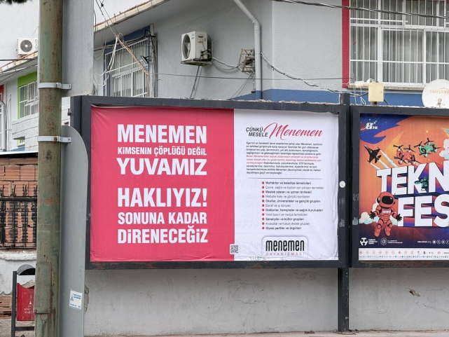 Menemen'in dört bir yanındaki reklam panolarına, "Menemen kimsenin çöplüğü değil! Yuvamız, haklıyız, sonuna kadar direneceğiz!" sloganıyla başlayan ve "Ege'nin en bereketli tarım arazilerine sahip olan Menemen, tarihinin en tehlikeli girişimiyle karşı karşıya! İlçemize her gün dökülecek binlerce ton çöp; tarımımızın, yer altı sularımızın, temizliğimizin, sağlığımızın ve geleceğimizin karanlığa hapsolması anlamına gelir. Bizler Menemenliler olarak atalarımızın emaneti ve evlatlarımıza miras olacak olan bu güzel kentin karanlığa teslim edilmesine izin vermeyeceğiz! Kadınlarımızla, çocuklarımızla, STK'larımızla, sanatçılarımız, basınımız, hukukçularımız, siyasilerimiz ve tüm hemşehrilerimizle birlikte Menemen dayanışması olarak bu haksız dayatmaya geçit vermeyeceğiz!" yazılı afişler asıldı. Tepkilere, Menemen Belediyesi ile birlikte muhtarlar, çevre sağlık ve toplum için çalışan dernekler, meslek odaları, ilçe halkı, gönüllü komiteleri, okullar, üniversiteler, öğrenci grupları, esnaf ve iş dünyası, doktor, hemşire ve sağlık kuruluşları, yerel basın ve medya temsilcileri, sanatçılar ve kültür grupları, avukatlar ve hukuk gruplarıyla siyasi parti temsilcileri destek verdi.