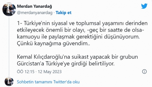 Gazeteci Merdan Yanardağ, "Kemal Kılıçdaroğlu'na suikast yapacak bir grubun Gürcistan'dan Türkiye'ye girdiği belirtiliyor" paylaşımı nedeniyle hakkında soruşturma başlatıldı.
