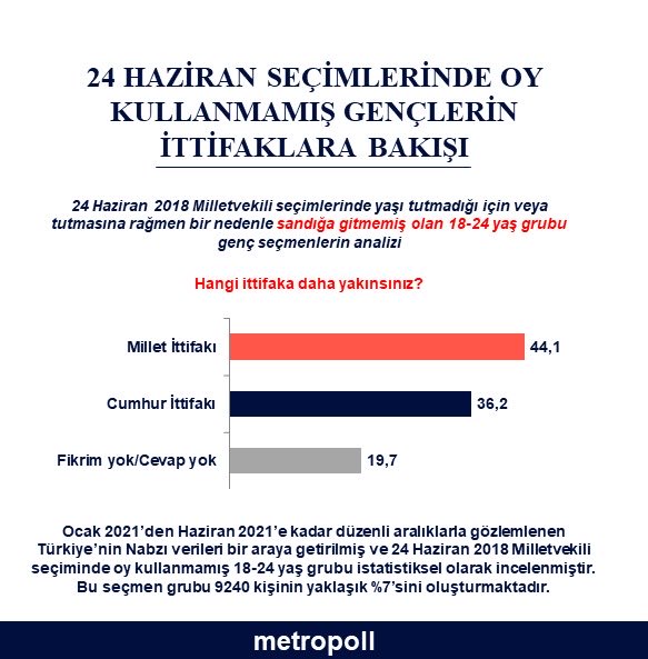 MetroPOLL Araştırma, 18-24 yaş arasındaki seçmenin ittifaklara bakışını araştırdığı ankette, genç seçmene “Hangi ittifaka daha yakınsınız” diye sordu.