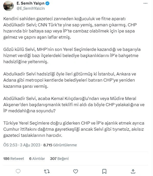 Abdülkadir Selvi geçtiğimiz günlerde katıldığı CNN Türk yayınında yerel seçimlerle ilgili değerlendirmelerde bulundu. Selvi, yorumlarıyla Cumhur İttifakı’nın ortağı MHP’yi kızdırdı.Sosyal medya hesabı üzerinden açıklamalarda bulunan MHP Genel Başkan Yardımcısı Semih Yalçın, Selvi ile ilgili şu ifadeleri kullandı:“Kendini sahiden gazeteci zanneden koğuculuk ve fitne aparatı Abdülkadir Selvi; CNN Türk’te yine sap yemiş, saman çıkarmış. CHP hızarında bir baltaya sap veya İP’te cambaz olabilmek için ipe sapa gelmez ve çapını aşan laflar etmiş.Gözü küllü Selvi, MHP’nin son Yerel Seçimlerde kazandığı ve başarıyla hizmet verdiği bazı ilçelerdeki belediye başkanlıklarını İP’e bahşetme hadsizliğine yeltenmiş.Abdulkadir Selvi hadsizliği öyle ileri götürmüş ki İstanbul, Ankara ve Adana gibi metropol kentlerde belediyeleri batıran CHP’ye yeniden kazanma şansı vermiş.Abdülkadir Selvi, acaba Kemal Kılıçdaroğlu’ndan veya Müdire Meral Akşener’den başdanışmanlık teklifi mi aldı da böyle CHP yalakalığına ve İP meddahlığına soyundu?Türkiye Yerel Seçimlere doğru giderken CHP ve İP’e ajanlık etmek ayrıca Cumhur ittifakını dağıtma gayretkeşliği ancak Selvi gibi tıynetsiz, akılsız gazeteci taslaklarının harcıdır.”