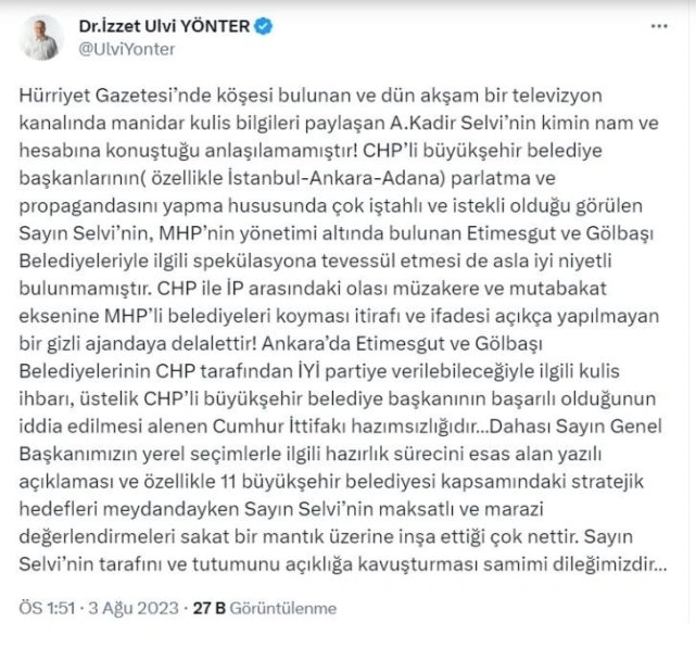 MHP Genel Başkan Yardımcısı İzzet Ulvi Yönter de Selvi'ye tepki gösterdi. Yönter, Twitter hesabından yaptığı açıklamada şunları söyledi: "Hürriyet Gazetesi’nde köşesi bulunan ve dün akşam bir televizyon kanalında manidar kulis bilgileri paylaşan A.Kadir Selvi’nin kimin nam ve hesabına konuştuğu anlaşılamamıştır! CHP’li büyükşehir belediye başkanlarının( özellikle İstanbul-Ankara-Adana) parlatma ve propagandasını yapma hususunda çok iştahlı ve istekli olduğu görülen Sayın Selvi’nin, MHP’nin yönetimi altında bulunan Etimesgut ve Gölbaşı Belediyeleriyle ilgili spekülasyona tevessül etmesi de asla iyi niyetli bulunmamıştır. CHP ile İP arasındaki olası müzakere ve mutabakat eksenine MHP’li belediyeleri koyması itirafı ve ifadesi açıkça yapılmayan bir gizli ajandaya delalettir! Ankara’da Etimesgut ve Gölbaşı Belediyelerinin CHP tarafından İYİ partiye verilebileceğiyle ilgili kulis ihbarı, üstelik CHP’li büyükşehir belediye başkanının başarılı olduğunun iddia edilmesi alenen Cumhur İttifakı hazımsızlığıdır… Dahası Sayın Genel Başkanımızın yerel seçimlerle ilgili hazırlık sürecini esas alan yazılı açıklaması ve özellikle 11 büyükşehir belediyesi kapsamındaki stratejik hedefleri meydandayken Sayın Selvi’nin maksatlı ve marazi değerlendirmeleri sakat bir mantık üzerine inşa ettiği çok nettir. Sayın Selvi’nin tarafını ve tutumunu açıklığa kavuşturması samimi dileğimizdir…"