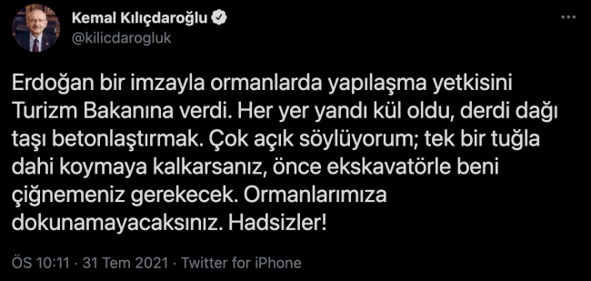 TBMM sayfasında yer alan açık oylama verilerine göre oylamaya katılmayan CHP Genel Başkanı Kemal Kılıçdaroğlu, kanun Resmi Gazete’de yayınlandıktan sonra sosyal medyada şu mesajı paylaşmıştı: “Erdoğan bir imzayla ormanlarda yapılaşma yetkisini Turizm Bakanına verdi. Her yer yandı kül oldu, derdi dağı taşı betonlaştırmak. Çok açık söylüyorum; tek bir tuğla dahi koymaya kalkarsanız, önce ekskavatörle beni çiğnemeniz gerekecek. Ormanlarımıza dokunamayacaksınız. Hadsizler!”