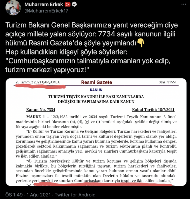 Oylamaya katılmayan CHP Çanakkale Milletvekili Muharrem Erkek ise sosyal medya hesabından şöyle demişti: “Turizm Bakanı Genel Başkanımıza yanıt vereceğim diye açıkça millete yalan söylüyor: 7734 sayılı kanunun ilgili hükmü Resmi Gazete’de şöyle yayımlandı. Hep kullandıkları klişeyi şöyle söylerler: ‘Cumhurbaşkanımızın talimatıyla ormanları yok edip, turizm merkezi yapıyoruz!’“