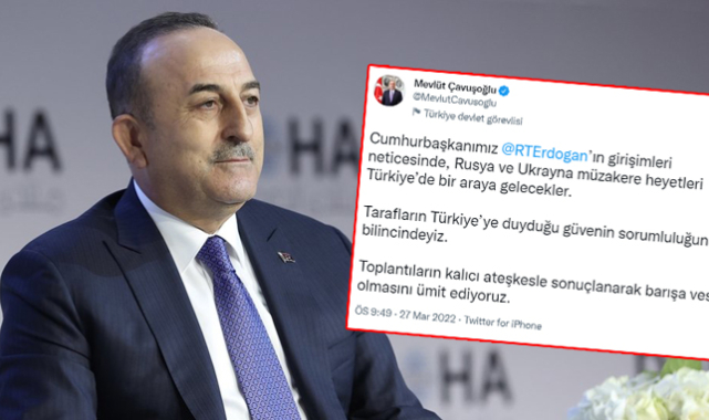 Dışişleri Bakanı Mevlüt Çavuşoğlu, resmi sosyal medya hesabı üzerinden, Rusya ve Ukrayna arasında yapılacak olan müzakereye ilişkin önemli açıklamalarda bulundu. Çavuşoğlu Twitter üzerinden yaptığı açıklamada, ‘’ Cumhurbaşkanımız Recep Tayyip Erdoğan’ın girişimleri neticesinde, Rusya ve Ukrayna müzakere heyetleri Türkiye’de bir araya gelecekler. Tarafların Türkiye’ye duyduğu güvenin sorumluluğunun bilincindeyiz. Toplantıların kalıcı ateşkesle sonuçlanarak barışa vesile olmasını ümit ediyoruz” dedi.