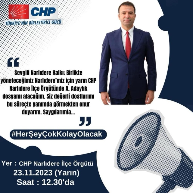 CHP Narlıdere Belediye Başkan Aday Adayı Serdar Kolay, sorunların çözümünde “Her şey çok kolay olacak” sloganıyla çıktığı yerel siyaset yolculuğunda; 23 Kasım 2023 Perşembe saat 12:30’da CHP Narlıdere İlçe Örgütü’nden ‘Belediye Başkanlığı aday adaylığı dosyası” teslim alarak, göreve talip olduğunu resmileştirmiş olacak.