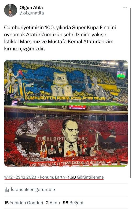 Suudi Arabistan’ın başkenti Riyad’da Galatasaray ve Fenerbahçe arasında oynanacak olan Süper Kupa final maçında ilk olarak İstiklal Marşı’mızın okunmasına izin verilmedi. Ardından Suudi yetkililer Cumhuriyetin 100. yılında iki takımın 'Yurtta Sulh, Cihanda Sulh' pankartı ile Mustafa Kemal Atatürk posteri ve tişörtü ile çıkma isteklerini de reddetti. Dün gece başlayan bu krizin ardından bugün henüz maç başlamadan saatler önce İzmir Büyükşehir Belediye Başkan Aday Adayı Olgun Atila, sosyal medya hesabından yaptığı paylaşımda bu finalin İzmir Atatürk Stadyumu’nda oynanması gerektiğini belirterek federasyona maçın İzmir’de oynanması yönünde çağrıda bulundu.