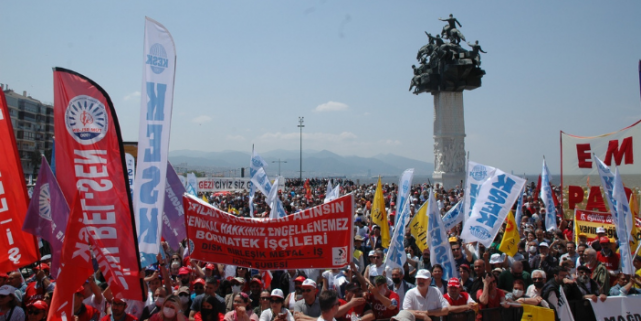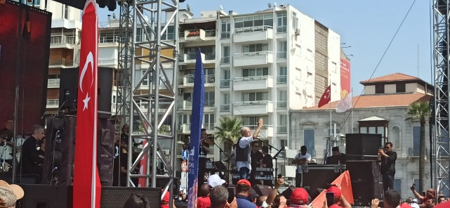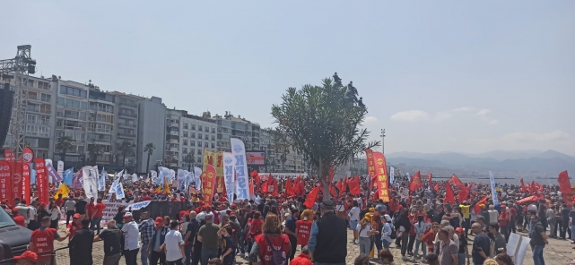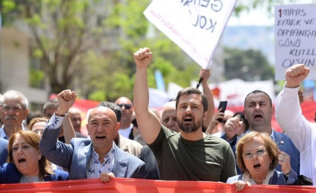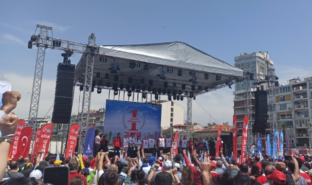 Gündoğdu Meydanı'ndan hükümete korkun çağrısı yapan İzmir Büyükşehir Belediye Başkanı Tunç Soyer, ''Saraylardan bizi seyredenlere bu meydandan onların en çok korktuğu cümleyle sesleniyoruz; ‘Ya hep beraber ya hiçbirimiz! Değerli kardeşlerim, bu cümle hak ettiğimiz refahın anahtarıdır. Bu gün gün büyüyen özgürlük mücadelemizin anahtarıdır. Bu muktedirlerin acı çektirdiği bizler, kadınlar, işçiler, çiftçiler, tüm emekçiler ve ezilen doğa, dünya bizim sırtımızda dönüyor. Bu dünyayı var eden bizleriz. İşte bugün yine meydanlardayız. Ve yine hep beraberiz, omuz omuzayız, kol kolayız, yan yanayız. Buraya kavgayı büyütmeye, hakkımızı istemeye, adalete susayan herkesin sesi olmaya geldik. Ey muktedirler korkun bizden. Korkun bizden! Açlığımızdan korkun! Dürüstlüğümüzden, açlığımızdan, aklımızdan, sel gibi büyüyen dayanışmamızdan korkun! Ey, kendini hükümdar sananlar, Mumcu’lardan, Deniz’lerden, Ali İsmail Korkmaz’lardan, ağaçlardan, Gezi’den, 1 Mayıs’tan korkun! Bizi her gün gömmeye çalıştınız. Her gün gömmeye çalışıyorsunuz ama unuttuğunuz bir şey var... Bizler tohumuz, gömüldükçe çoğalarak geliyoruz. Bir gidip, bin gelen bizlerden korkun! Kapınızdayız, yakanızdayız. Bu düzeni topla, tüfekle değil, aklımızla yıkacağız. Vicdanımızla yıkacağız. Sizi kin ve nefretle değil, barış ve kardeşliğimizle yeneceğiz. Güçlüyüz, kazanacağız. 1 Mayıs bizim adımız, şerefimizdir, kardeşliğimizdir. Ya hep beraber, ya hiçbirimiz. Yaşasın 1 Mayıs!" ifadelerini kullandı.