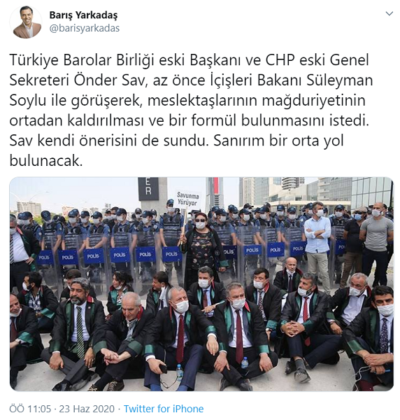 Gazeteci Barış Yarkadaş, eski Türkiye Barolar Birliği Başkanı ve eski CHP Genel Sekreteri Önder Sav'ın İçişleri Bakanı Süleyman Soylu ile görüştüğünü ve avukatların mağduriyetleri konusunda bir orta yol bulma çabasının oluştuğunu duyurdu.