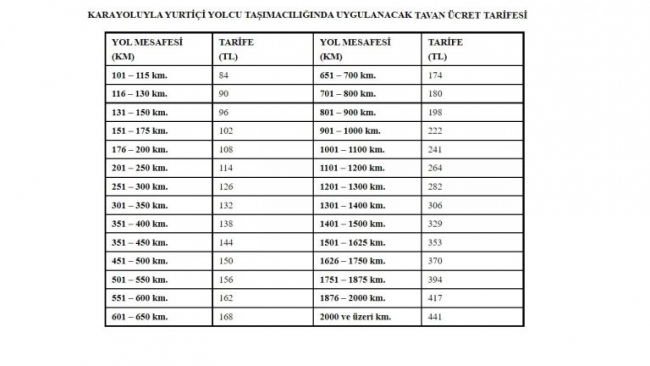 Şehirlerarası otobüs biletlerine tavan ücret uygulaması getirildi. Tavan ücret mesafeye göre 84 ile 441 lira arasında uygulanacak.