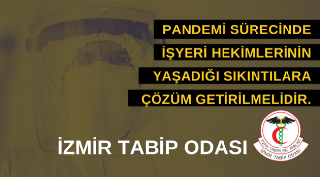 İzmir Tabip Odası'ndan yapılan yazılı açıklamada, pandemi sürecinde işyeri hekimlerinin yaşadığı sıkıntılara çözüm getirilmesi istendi. İşyeri hekimlerinin sorunlarına ilişkin hazırlanana raporda, "Tüm dünyayı etkisi altına alan bir salgın hastalık dönemini yaşıyoruz. Salgının kontrol altına alınabilmesi için toplumsal hareketliliğin kısıtlanarak enfeksiyon zincirinin kırılması zorunludur. Birçok sektörde üretime aynı hızla devam edilmek istenmesi nedeniyle kısıtlamalar eğlence sektörü, kişisel bakım sektörü, eğitim gibi alanlarda yapılmıştır. Aralıksız çalışmaya devam eden sektörlerde çalışanların sağlığını korumak ve salgının yayılmasını engellemek işyeri hekimlerine kalmıştır. Halihazırda özlük hakları, çalışma koşulları ve çalışma süreleri (işçi başına ayrılması öngörülen süre) kendilerinden beklenen görev ve sorumluluklar karşısında yetersiz olan işyeri hekimleri pandemi yükü altında tükenmektedirler." denildi.Raporda, pandemi sürecinde iş yeri hekimliği uygulamasında yaşanan sıkıntılar şu şekilde özetlendi:
