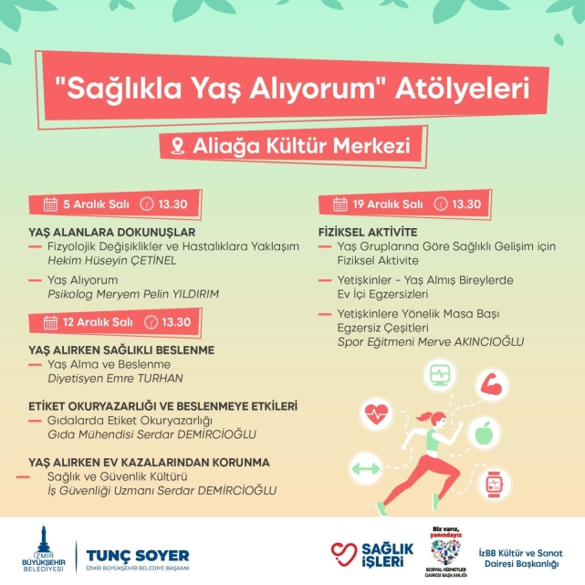 İzmir Büyükşehir Belediyesi ile Karabağlar Belediyesi iş birliğiyle farklı meslek gruplarından alanında uzman kişilerin katılımıyla “Sağlıkla Yaş Alıyorum” farkındalık seminerleri ve atölyeleri düzenlenecek. Programlar 21 Kasım-20 Aralık 2023 tarihleri arasında Aliağa Kültür Merkezi ile Karabağlar Belediyesi Şehit Gürcan Ulucan, Çalıkuşu ve Nokta semt merkezlerinde olacak. Psikolog, diyetisyen, hekim, gıda mühendisi, spor eğitmeni ve iş güvenliği uzmanı eğitimcilerin öncülüğünde yapılacak seminerlerde yurttaşlar; doğru beslenmeden fiziksel egzersizlere, etiket okuryazarlığından yaş almanın psikolojik etkilerine kadar pek çok konuda bilgi sahibi olacak. Güvenli, sağlıklı ve mutlu yaş almanın ipuçlarının verileceği seminerlerin bir kısmı 3 haftalık katılım belgeli atölyeler şeklinde düzenlenecek.Sağlıkla yaş alıyorum farkındalık seminerleri etkinliklerinin programı şöyle:Aliağa Kültür Merkezi (21 Kasım 2023- Saat 10:30): “Yaş alanlara dokunuşlar”-Fizyolojik Değişiklikler ve Hastalıklara Yaklaşım-Hekim Hüseyin Çetinel, “Yaş Alıyorum”- Psikolog Meryem Pelin Yıldırım, “Yaş alırken sağlıklı beslenme” - Yaş Alma ve Beslenme - Diyetisyen Emre Turhan, “Fiziksel Aktivite”, “Yaş Gruplarına Göre Sağlıklı Gelişim için Fiziksel Aktivite - Spor Eğitmeni Merve Akıncıoğlu.Karabağlar Belediyesi-Şehit Gürcan Ulucan Semt Merkezi ((22 Kasım 2023 Saat 10:00)-Karabağlar Belediyesi-Nokta Semt Merkezi (29 Kasım 2023 Saat 10:00)-“Yaş alanlara dokunuşlar”-Fizyolojik Değişiklikler ve Hastalıklara Yaklaşım-Hekim Hüseyin Çetinel, Sağlıklı Yaş Alıyorum Atölyeleri.Aliağa Kültür Merkezi 1. Modül (05 Aralık 2023 – 13:30)“Yaş alanlara dokunuşlar”-Fizyolojik Değişiklikler ve Hastalıklara Yaklaşım-Hekim Hüseyin Çetinel, “Yaş Alıyorum”- Psikolog Meryem Pelin Yıldırım.Aliağa Kültür Merkezi 2. Modül (12 Aralık 2023 – 13:30)“Yaş alırken sağlıklı beslenme” - Yaş Alma ve Beslenme - Diyetisyen Emre Turhan, Etiket Okuryazarlığı ve beslenmeye etkileri” -Gıdalarda Etiket Okuryazarlığı - Gıda Mühendisi Serdar Demircioğlu, “Yaş alırken ev kazalarından korunma” -Sağlık ve Güvenlik Kültürü - İş Güvenliği Uzmanı Serdar Demircioğlu.Aliağa Kültür Merkezi 3. modül (19 Aralık 2023 – 13:30)“Fiziksel Aktivite”- Yaş Gruplarına Göre Sağlıklı Gelişim için Fiziksel Aktivite-Yetişkinler-Yaş Almış Bireylerde Ev İçi Egzersizleri-Yetişkinlere Yönelik Masa Başı Egzersiz ÇeşitleriSpor Eğitmeni Merve Akıncıoğlu.Karabağlar Çalıkuşu Semt Merkezi 1. Modül (06 Aralık 2023 – 10:00)“Yaş alanlara dokunuşlar”-Fizyolojik Değişiklikler ve Hastalıklara Yaklaşım-Hekim Hüseyin Çetinel, “Yaş Alıyorum”- Psikolog Meryem Pelin Yıldırım.Karabağlar Çalıkuşu Semt Merkezi 2. Modül (13 Aralık 2023 – 10:00)“Yaş Alırken Sağlıklı Beslenme”-Yaş Alma ve Beslenme - Diyetisyen Emre Turhan -“Etiket okuryazarlığı ve beslenmeye etkileri” - Gıdalarda Etiket Okuryazarlığı - Gıda Mühendisi Serdar Demircioğlu, “Yaş alırken ev kazalarından korunma” -Sağlık ve Güvenlik Kültürüİş Güvenliği Uzmanı Serdar Demircioğlu.Karabağlar Çalıkuşu Semt Merkezi 3. Modül (20 Aralık 2023 – 10:00)“Fiziksel Aktivite”- Yaş Gruplarına Göre Sağlıklı Gelişim için Fiziksel Aktivite-Yetişkinler-Yaş Almış Bireylerde Ev İçi Egzersizleri-Yetişkinlere Yönelik Masa Başı Egzersiz ÇeşitleriSpor Eğitmeni Merve Akıncıoğlu.