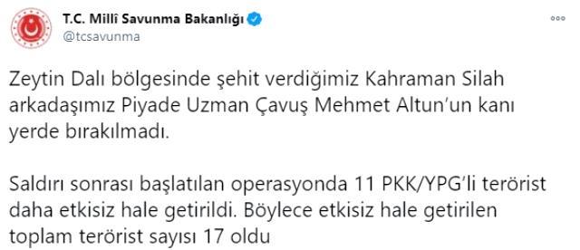 Milli Savunma Bakanlığı'nın Twitter hesabından yaptığı açıklamada, "Zeytin Dalı bölgesinde şehit verdiğimiz Kahraman Silah arkadaşımız Piyade Uzman Çavuş Mehmet Altun'un kanı yerde bırakılmadı. Saldırı sonrası başlatılan operasyonda 11 PKK/ YPG'li terörist daha etkisiz hale getirildi. Böylece etkisiz hale getirilen toplam terörist sayısı 17 oldu" denildi.