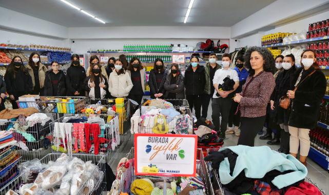 Gaziemir Belediyesi’nin yardımseverlerle ihtiyaç sahiplerini bir araya getirdiği Sosyal Market, ilçenin iyilik ve dayanışma merkezi oldu. Sosyal Markette, yardımseverlerin yaptığı bağışlar, belediye eliyle ihtiyaç sahiplerine ulaştırılıyor. Mart ayında 547 ailenin ihtiyaçlarını karşıladığı Sosyal Market’e yapılan bağışlarla ilçede dayanışma büyüyor. Her kesimden yurttaşın bağışlarıyla katkıda bulunduğu Sosyal Market’e son olarak Dokuz Eylül Koleji öğrencileri bağışta bulundu. Öğretmenleriyle birlikte iyilik merkezini ziyaret eden öğrencilere, Belediye Başkan Yardımcısı Hülya Abay ile Sosyal Market sorumlusu Ceren Öztepe, Sosyal Market’in işleyişi hakkında bilgi verdi. Sosyal projenin çalışma sistemini öğrenen öğrenciler, kırtasiye, kitap, giysi ve gıda ürünlerinin yer aldığı bağışlarını marketin raflarına dizdiler.