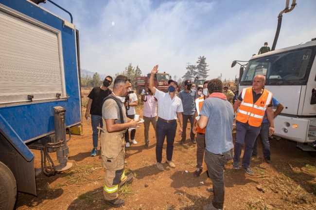 Türkiye'nin dört bir yerinde çıkan orman yangınlarıyla mücadele devam ederken, İzmir Büyükşehir Belediyesi de desteklerini sürdürüyor. Bölgeye insani yardım malzemesi gönderen İzmir Büyükşehir Belediyesi, Antalya, Manavgat, Muğla, Marmaris, Bodrum ve Milas yangınlarının söndürülmesi için de destek sağlıyor. Yangın söndürme çalışmaları devam ederken, İzmir Büyükşehir Belediye Başkanı Tunç Soyer de Muğla'da yangından zarar gören mahallelerde incelemelerde bulundu. Muğla Büyükşehir Belediye Başkanı Osman Gürün ve Bodrum Belediye Başkanı Ahmet Aras'tan bilgi alan Soyer'e İzmir Büyükşehir Belediyesi Genel Sekreteri Dr. Buğra Gökçe ile İzmir Büyükşehir Belediyesi İtfaiye Dairesi Başkanı İsmail Derse eşlik etti. Ziyarette CHP Grup Başkanvekili Engin Altay da yer aldı.