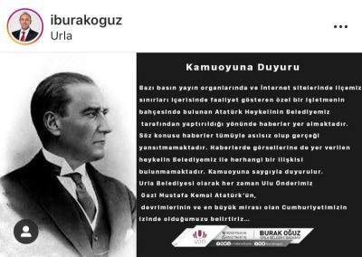 Başkan Oğuz sosyal medya hesabından yaptığı açıklamada, "Basın yayın organlarında ve İnternet sitelerinde yer alan eleştirilere konu Atatürk heykeli ile ilgili işletme sahibi ile görüşme sağlanmış ve gün içerisinde kaldırılmasına karar verilmiştir. Kamuoyuna duyurulur" ifadelerini yer verdi.