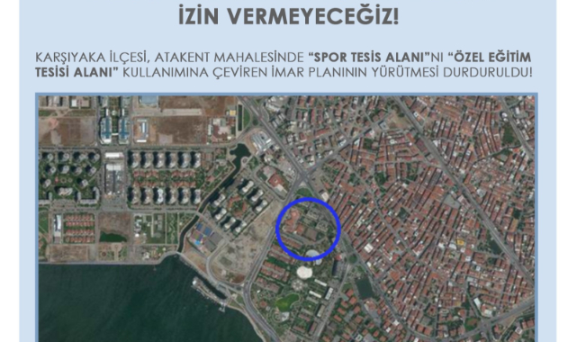 TMMOB Mimarlar Odası İzmir Şubesi ve TMMOB Şehir Plancıları Odası İzmir Şubesi; Karşıyaka İlçesi, Atakent Mahallesi'ndeki 'Spor Tesis Alanı'nı, 'Özel Eğitim Tesis Alanı' kullanımına çeviren imar planının yürütülmesinin durdurulduğunu açıkladı.