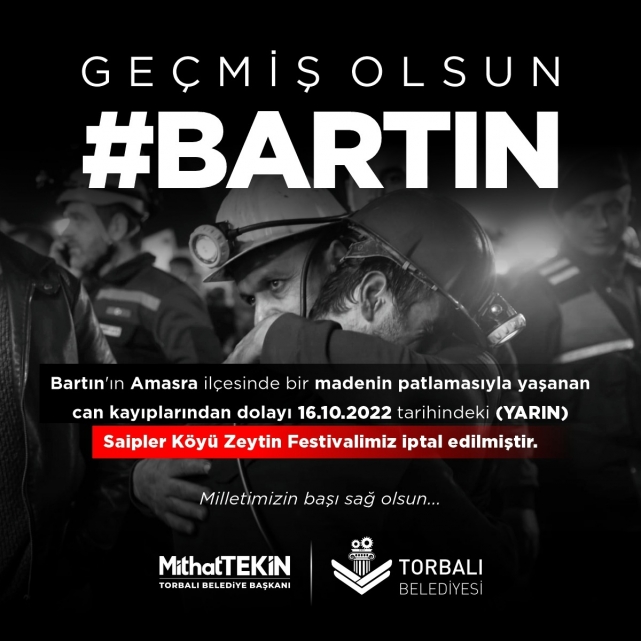 Yarın Saipler’de gerçekleşecek olan festivalin iptal edildiğini duyuran Torbalı Belediye Başkanı Mithat Tekin, “Bartın’dan dün geceden beri ardı ardına gelen acı haberler yüreğimizi dağladı. Yaşanan bu vahim olaydan dolayı yarın (16.10.2022 Pazar) yapacağımız Saipler Zeytin Festivalimizi iptal ettik. Hayatını kaybeden emekçi kardeşlerimize Cenab-ı Allah’tan rahmet, ailelerine başsağlığı ve sabırlar diliyorum. Milletimizin başı sağ olsun” ifadelerini kullandı.