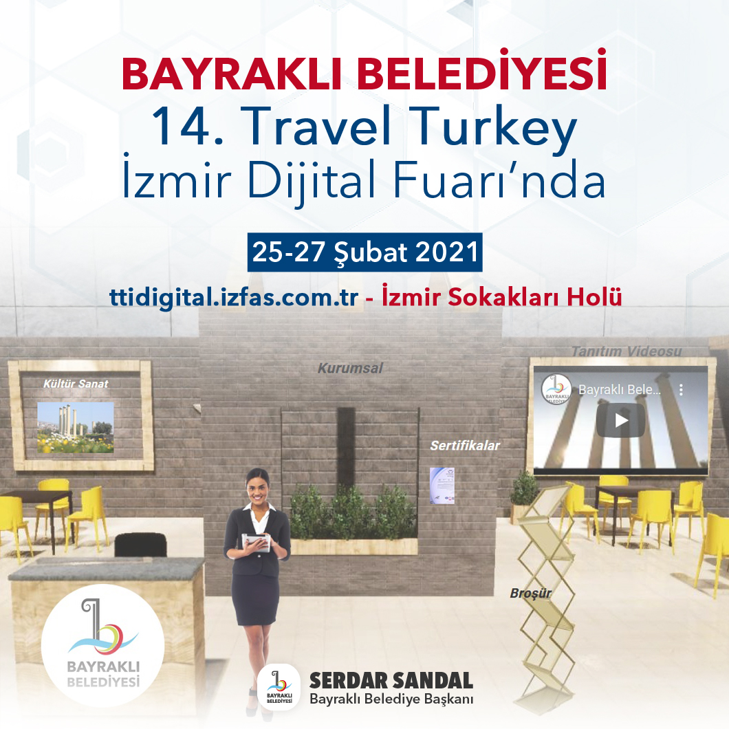 İzmir Büyükşehir Belediyesinin ev sahipliğinde İZFAŞ'ın kendi dijital altyapısı ile sadece sanal olarak düzenlenecek ve dünya çapındaki dijital fuarlar arasındaki yerini alacak Travel Turkey, pandemi koşulları ve sektör talebi nedeniyle bu yıl internet üzerinden gerçekleştiriliyor. bayraklı belediyesi de turizmin kalbinin attığı fuarda yerini alarak kültür, turizm faaliyetleri ile bu kapsamdaki projelerini tanıtıyor. ‘ttidigital.izfas.com.tr’ internet sitesi üzerinden gezilebilen dijital Bayraklı Belediyesi standında belediye etkinlikleri ve projeleri yer alıyor. İzmir Sokakları bölümünde Bayraklı tanıtım videosuyla açılan internet ortamındaki standın bulunduğu ana sayfada 360 derece sanal turla içeriklere ulaşılabiliyor. fuar kapsamında Smyrna Höyüğü de 360 derece sanal gezinti videosu ile ziyaret edilebiliyor. Ayrıca 'Dünya Çocuk Ve Gençlik Kenti Bayraklı' vizyon projesi ile evlerinde bilgisayar ve interneti olmayan çocuklar için hayata geçirilen TV BEK projesi, çocuklara ve yetişkinlere yönelik spor kursları, kültür sanat etkinlikleri ve ulusal bayram kutlamaları ile ücretsiz sağlık hizmeti çalışmaları çeşitli görsellerle ziyaretçilere sunuluyor.
