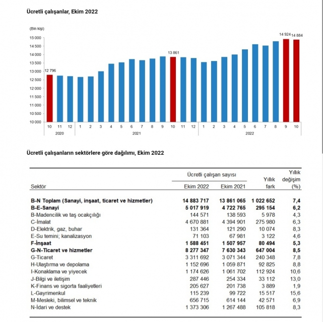 Türkiye İstatistik Kurumu, ekim ayına ilişkin ücretli çalışan istatistiklerini yayımladı.Verilere göre, sanayi, inşaat ve ticaret-hizmet sektörleri toplamında ücretli çalışan sayısı ekim ayında bir önceki yılın aynı ayına göre yüzde 7.4 arttı. Ücretli çalışan sayısı bir önceki yılın aynı ayında 13 milyon 861 bin 65 kişi iken, ekim ayında 14 milyon 883 bin 717 kişi oldu.Ücretli çalışanların alt detaylarına bakıldığında; ekim ayında ücretli çalışan sayısı yıllık olarak sanayi sektöründe yüzde 6.2, inşaat sektöründe yüzde 5.3 ve ticaret-hizmet sektöründe yüzde 8.5 arttı.Sanayi, inşaat ve ticaret-hizmet sektörleri toplamında ücretli çalışan sayısı ekim ayında bir önceki aya göre yüzde 0.5 arttı. Ücretli çalışanların alt detaylarına bakıldığında; Ekim ayında ücretli çalışanlar aylık olarak sanayi sektöründe yüzde 0.2, inşaat sektöründe yüzde 1.0 ve ticaret-hizmet sektöründe yüzde 0.5 arttı.