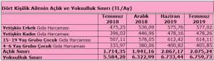 TÜRK-İŞ temmuz ayı açlık ve yoksulluk sınırını açıkladı! Temmuz 2019 ayı sonucuna göre: Dört kişilik bir ailenin sağlıklı, dengeli ve yeterli beslenebilmesi için yapması gereken aylık gıda harcaması tutarı (açlık sınırı) 2,075.24 lira, Gıda harcaması ile birlikte giyim, konut (kira, elektrik, su, yakıt), ulaşım, eğitim, sağlık ve benzeri ihtiyaçlar için yapılması zorunlu diğer aylık harcamalarının toplam tutarı ise (yoksulluk sınırı) 6,760.73 lira ve Evli olmayan-çocuksuz bir çalışanın “yaşama maliyeti” ise aylık 2,564.52 lira olarak hesaplandı.