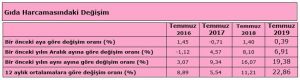 TÜRK-İŞ´in verileri temel alındığında “mutfak enflasyonu”ndaki değişim 2019 Temmuz ayında şöyle açıklandı: Ankara´da yaşayan dört kişilik bir ailenin “gıda için” yapması gereken asgari harcama tutarı bir önceki aya göre yüzde 0.39 arttı. Yılın ilk altı yedi sonunda fiyatlardaki artış yüzde 6.91 oldu. Gıda enflasyonunda son on iki ay itibariyle artış yüzde 19.38 oldu. Yıllık ortalama artış yüzde 22.86 oldu.