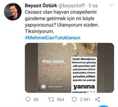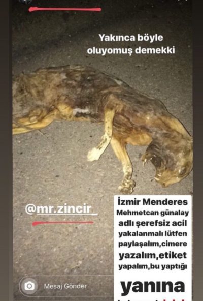 Bir sokak köpeğine yaptığı işkenceyi sosyal medya hesabından paylaşan şahsa tepki yağdı. Paylaşımda öldürdüğü köpeği yaktıktan sonra fotoğrafını çektiği görülen şahsın diğer sosyal medya kullanıcıları tarafından İzmir Menderes'te ikamet ettiği öne sürüldü.