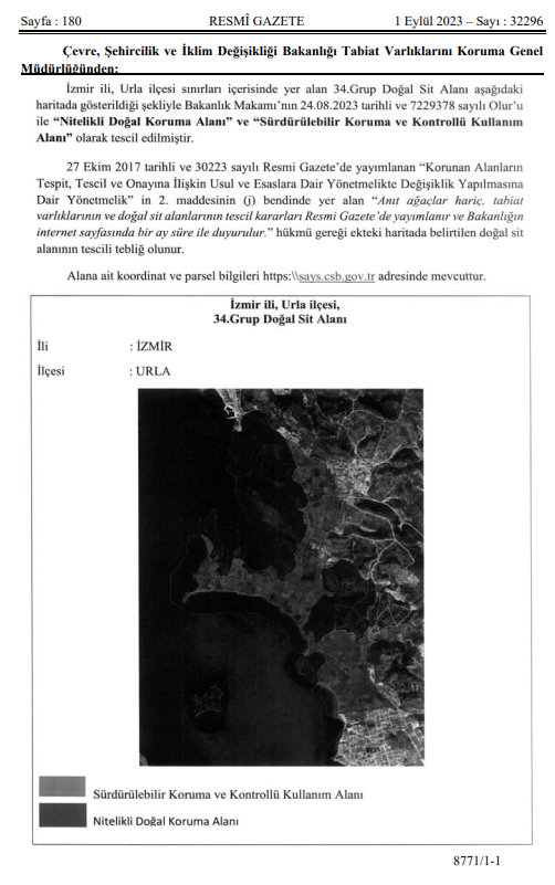 Resmi Gazete'nin bugünkü sayısında yayımlanan karara göre, İzmir’in Urla ilçesine bağlı Özbek bölgesinde yer alan 34. Grup Doğal SİT Alanı'nın derecesi düşürüldü.