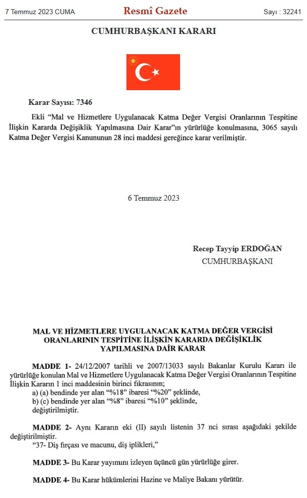 Cumhurbaşkanı Recep Tayyip Erdoğan'ın imzasıyla Resmi Gazete'de yayımlanan kararlara göre; KDV, yüzde 18 olan ürünlerde yüzde 20’ye, yüzde 8 olan ürünlerde ise yüzde 10’a çıkarıldı.
