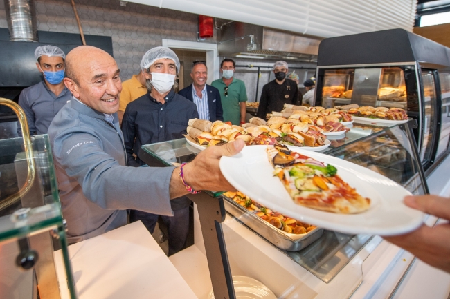 Başkan Tunç Soyer, Grand Plaza A.Ş. Genel Müdürü Hasan İkat ile birlikte Yasemin Kafe'yi gezdi ve bilgi aldı. Soyer'e üzerinde isminin yazdığı bir aşçı önlüğü hediye edildi.