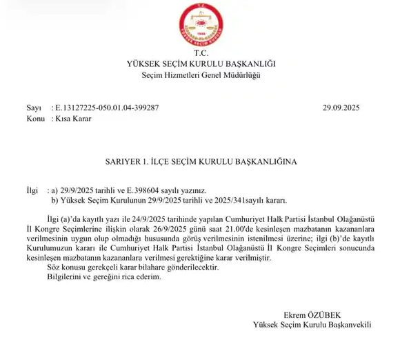 Cumhuriyet Halk Partisi (CHP) İstanbul il yönetiminin mahkeme kararı ile yerine kayyum atanması sonrasında gerçekleştirilen olağanüstü il kongresinde yeniden başkan seçilen Özgür Çelik, bugün mazbatasını aldı.Cuhmuriyet'in haberine göre, Çelik, saat 15.04'te Sarıyer İlçe Seçim Kurulu'na geldi.CHP İstanbul İl Kongresi’nin mahkeme kararıyla iptal edilmesinin ardından il yönetimi görevden uzaklaştırılmış ve aralarında Gürsel Tekin’in de bulunduğu bir kayyum heyeti atanmıştı.CHP olağanüstü kongre toplamış, aynı gün mahkeme yoluyla kongre durdurulmak istenmişti. Olağanüstü toplanan Yüksek Seçim Kurulu (YSK), kongrenin devam etmesine karar vermiş, "Başlayan kongrenin iptal edilmesi mümkün değildir" açıklaması yapmıştı.Engelleme girişimlerine rağmen gerçekleştirilen CHP İstanbul Olağanüstü İl Kongresi'nde yeniden il başkanı seçilen Özgür Çelik, mazbatasını almak üzere saat 15.04'te Sarıyer İlçe Seçim Kurulu'na geldi.