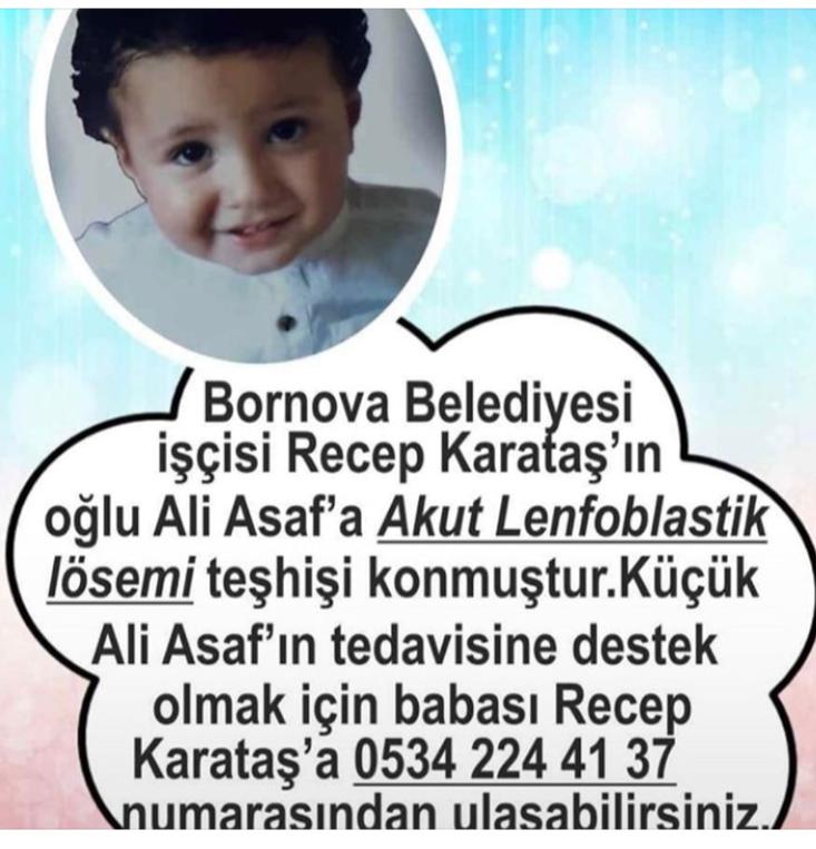 Bornova Belediyesi Emekçilerin' den Recep KARATAŞ'ın oğlu Ali ASAF' a Akut Lenfoblastik Lösemi teşhisinin konulmasının ardından Karataş ailesini yanlız bırakmayan YER.HİZ.DER. Başkanı Halis GÜNEŞ ve Yönetiminin yapmış olduğu anlamlı ziyaretin ardından. Ali ASAF' ın sağlık durumu ile ilgili detaylı bilgiyide edindikten sonra. Yer.Hiz.Der. olarak ailenin her koşulda yanında olacağını belirten Halis GÜNEŞ, Ali ASAF için harekete geçerek seferberlik ilan etti. Millet Vekillerimize, Belediye Başkanlarımıza, Sivil Toplum Kuruluşları ve Spor Kulüplerini bu tür konularda duyarlı olmaya davet etti...